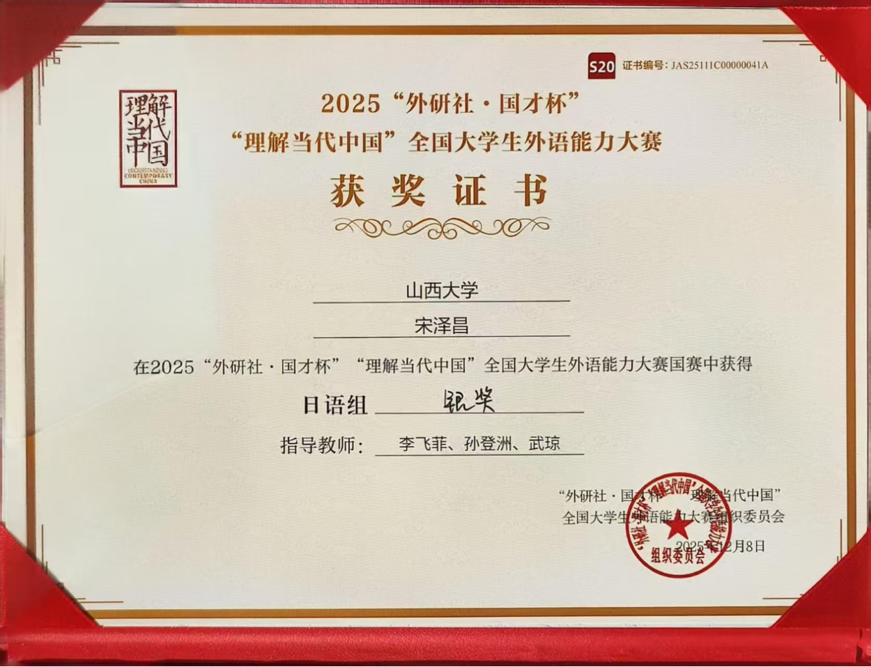 “外研社·国才杯”“理解当代中国”全国老员工外语能力大赛由北京外国语大学主办,外语教学与研究出版社承办,是目前国内规模最大、水平最高、影响力最广的外语类赛事之一。本届大赛日语组竞争尤为激烈,经过校赛、省赛和国赛一轮的层层选拔,最终来自全国50所高校的60名选手晋级全国第二轮决赛。宋泽昌同学凭借过硬的日语综合运用能力与稳定的临场发挥,成功斩获银奖,在全国舞台上彰显了山大学子的风采。