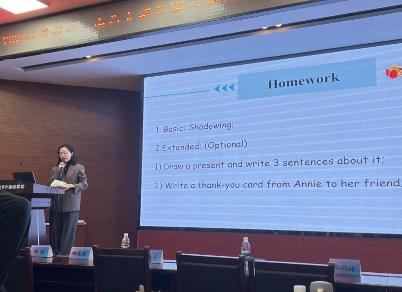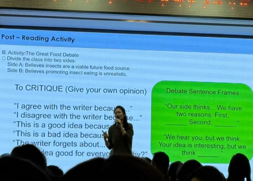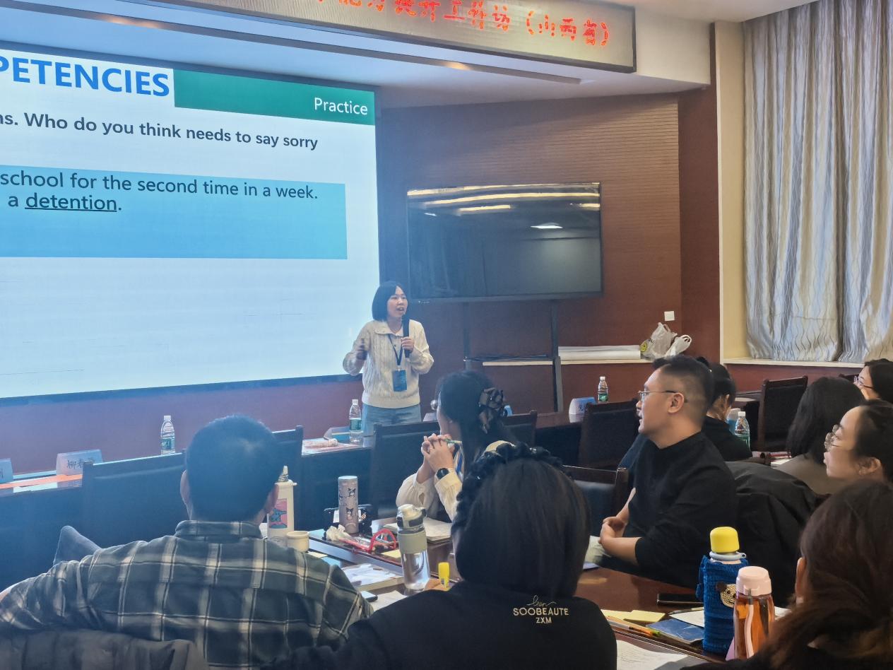 在内容设计上,工作坊突破传统“讲授式”培训模式,采用“实践深研—课堂模拟—案例研讨—成果展示”的全程学习方式,推动教师在真实任务情境中深度学习。无论是单元整体教学设计、思维任务链课堂重构,还是与国际考试对标的能力训练,均贯穿“以员工发展为核心、以学语并重为途径、以深度学习为目标”的教育理念。参训教师在小组研讨中充分交流教案结构、任务序列、评价标准等内容,成果展示阶段以三分钟短讲呈现思考成果,专家现场点评指导,助力教师将教育理念切实转化为方法论与实操能力。