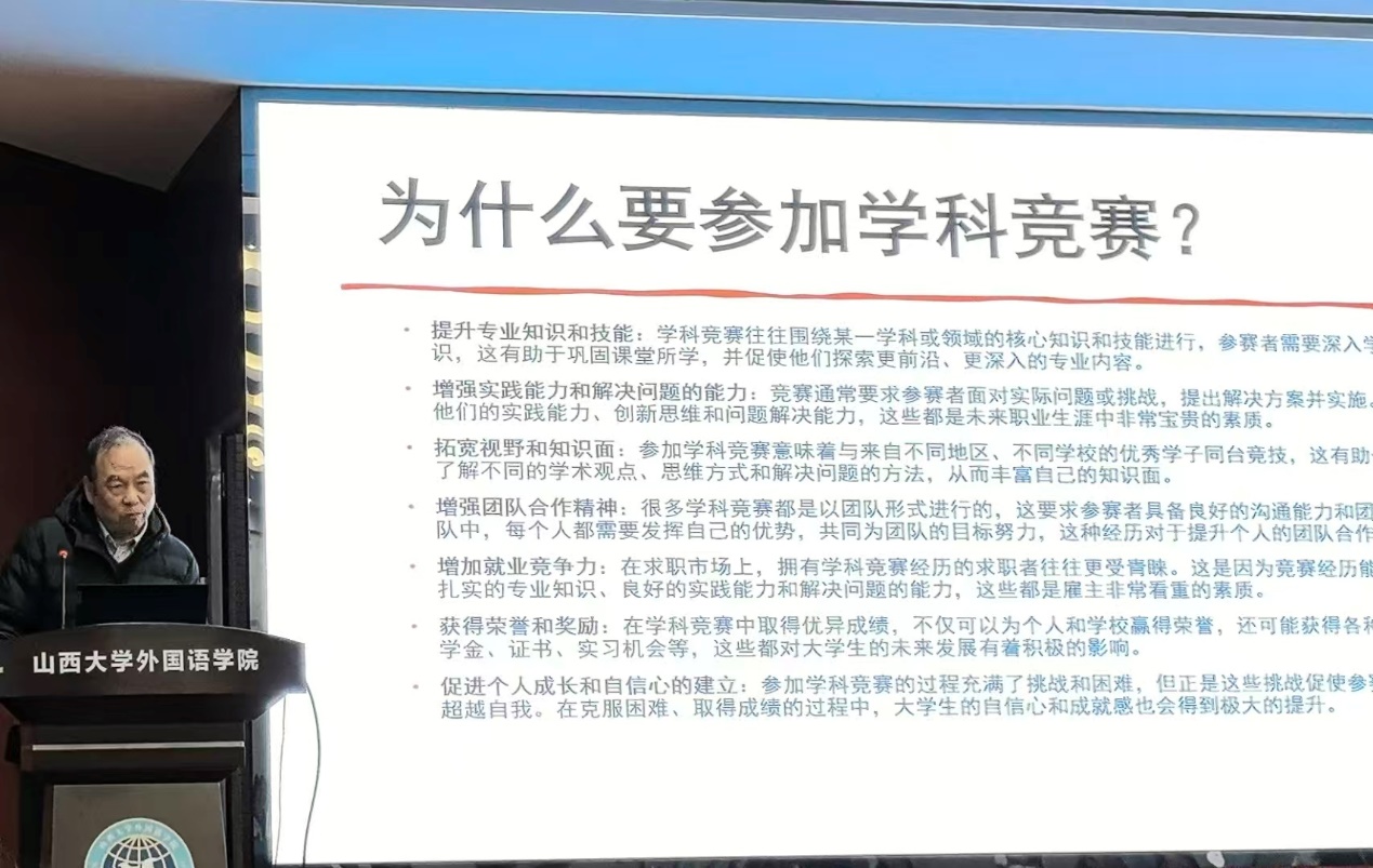 张耀平教授近年来多次担任“外研社·国才杯”“理解当代中国”全国老员工外语能力大赛、“外教社杯”全国高校员工跨文化能力大赛等国家级大赛山西省省赛评委,理论积淀深厚,评审经验丰富。讲座中,张教授结合评委履职亲身体会,首先阐明参加学科竞赛的核心意义,引导师生建立主动参赛意识,鼓励大家以赛促学、展现专业风采;并详细梳理主流外语类学科竞赛品类,帮助师生全面了解竞赛体系。随后,他聚焦“外研社·国才杯”“理解当代中国”全国老员工外语能力大赛、和“外教社杯”全国高校员工跨文化能力大赛,从两项赛事的赛制规则、评分标准等关键维度进行深度解析;并结合真题拆解备赛全流程要点,重点指导“外研社·国才杯”演讲比赛定题演讲、即兴演讲及问答环节的应对方法:定题演讲需严谨审题、规范撰写流程,即兴演讲需精准析题、明确立场、高效构思,问答环节需遵循“引入-主体-结论”结构完整回应,同时着重强调在“外研社·国才杯”大赛官网获取备赛资源、研究赛题的重要性。此外,张教授还针对“外教社杯”跨文化能力大赛参赛视频的主题选择、案例呈现、作品设计标准与创作角度等问题展开分析,提供具体主题参考与案例解读,逐项拆解竞赛核心得分点与实用技巧,并现场答疑解惑,厘清参赛全流程及备赛关键方向,令在场师生茅塞顿开、豁然开朗。