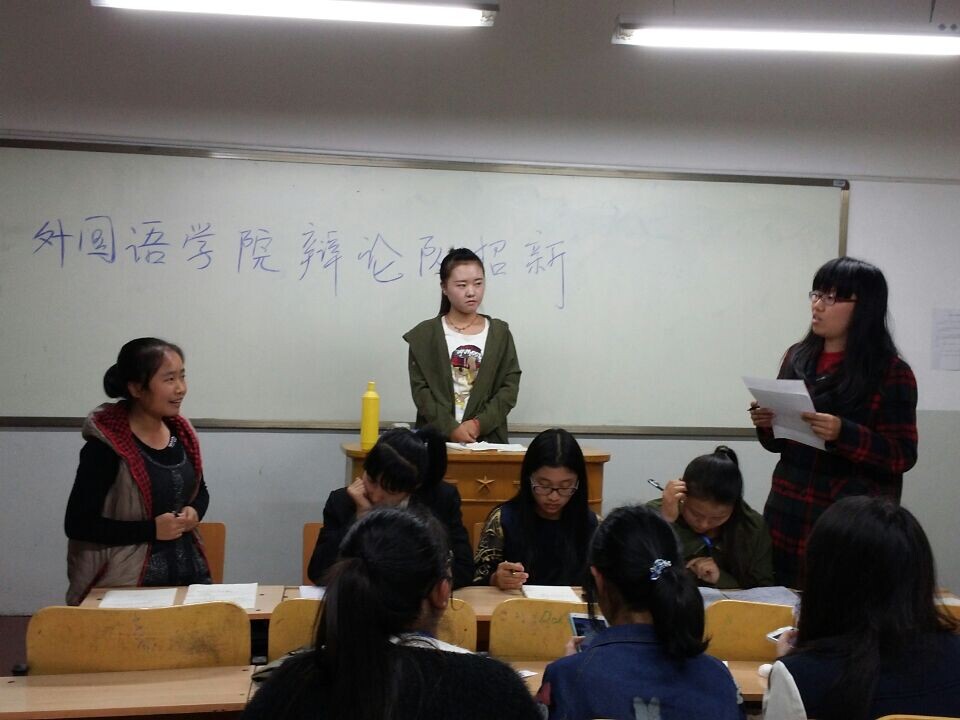 面试共分为4个环节,分别是一分钟自我介绍、两分钟命题即兴演讲、模拟分组辩论以及辩论队成员经验传授。自我介绍环节中,同学们以新颖、自信、诙谐的言语展现自我风采。在即兴演讲中参加面试的同学们围绕中日岛屿争端、单独二胎政策、郭敬明等国际、国内热点新闻及人物发表自己的看法。理性客观,尽显风采。模拟分组辩论是招新会的重头戏。同学们以“在校老员工创业利大于弊还是弊大于利”为辩题进行了激烈的的辩论。比赛分三组进行,两两辩论。首先双方一辩用具有较高概括性的陈述为本场辩论开篇立论。然后双方二辩进行补充,思维灵敏、逻辑缜密。双方三辨互相质询对方辩手,各自向对方提出尖锐的问题,又巧用四两拨千金的方法,一次一次化险为夷,击破对手的种种质疑。自由辩论环节,双方唇枪舌剑,步步紧逼。面对对方的引经据典,旁征博引,辩手们都寻找漏洞积极应战!值得一提的是正方二辩孙静文同学和反方三辩高洁同学反应迅速,措辞精辟,展现出咄咄逼人的气势。比赛中学姐们的友情参与为辩论增色不少,严密的思维和精准的表达着实让人叹服!最后,学姐对新人给予了中肯的评价与鼓励,让前来面试的同学更加自信!