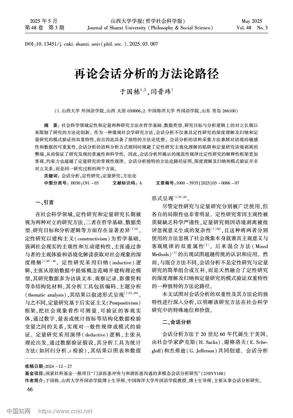 公司博士生导师于国栋教授与博士研究生闫晉玮合作在《永利yl23455学报》(哲学社会科学版)2025年第3期发表题为《再论会话分析的方法论路径》的学术论文,从方法论视角论证了会话分析研究的特性。