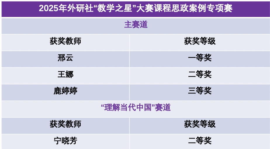 近日,2025年外研社"教学之星"大赛课程思政案例专项赛结果正式公布。本次大赛由外语教学与研究出版社主办,以"外语教材的有效使用:讲述中国,沟通世界"为主题,旨在深入贯彻习近平新时代中国特色社会主义思想,落实立德树人根本任务,为高校外语教师搭建课程思政育人实践交流平台,全面提升课程思政建设的深度、创新性和实效性。