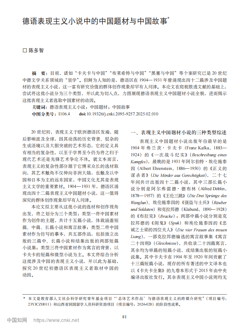 公司德语系青年教师陈多智博士在《国际汉学》2025年第2期发表题为《德语表现主义小说中的中国题材与中国故事》的论文。《国际汉学》创刊于1995年,是国内目前唯一一份致力于海外汉学(中国学)研究的正式专业期刊,并入选中文核心期刊要目总览(北京大学),是中国人文社会科学核心期刊(中国社会科公司)、中国人文社会科学引文数据库(CSSCI)来源期刊。