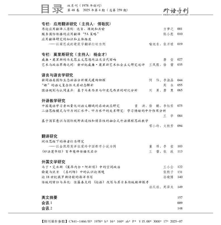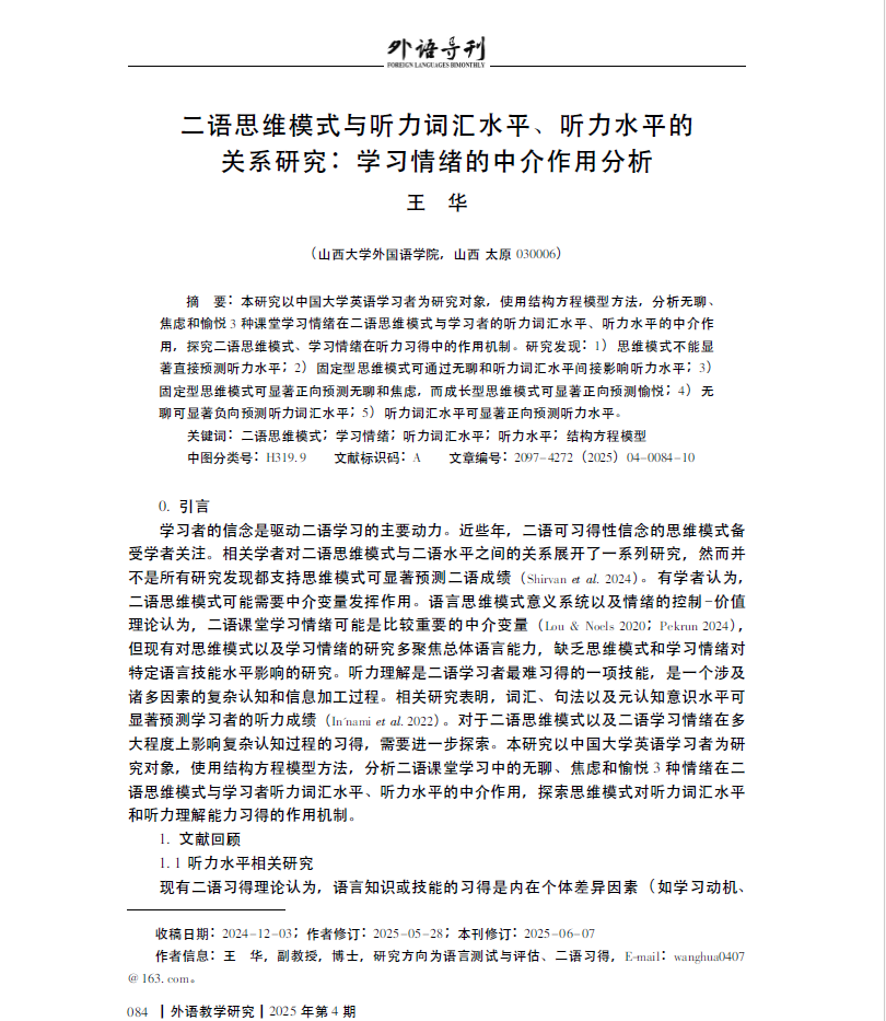 公司王华副教授在《外语导刊》2025年第4期发表题为“二语思维模式与听力词汇水平、听力水平的关系研究:学习情绪的中介作用分析”的研究论文。《外语导刊》(Foreign Languages Bimonthly),原《解放军永利yl23455学报》,创刊于1978年,由国防科技大学永利yl23455主办,是外国语言文学研究学术刊物,现为CSSCI来源期刊、中文外国语类核心期刊和复印报刊资料重要转载来源期刊。