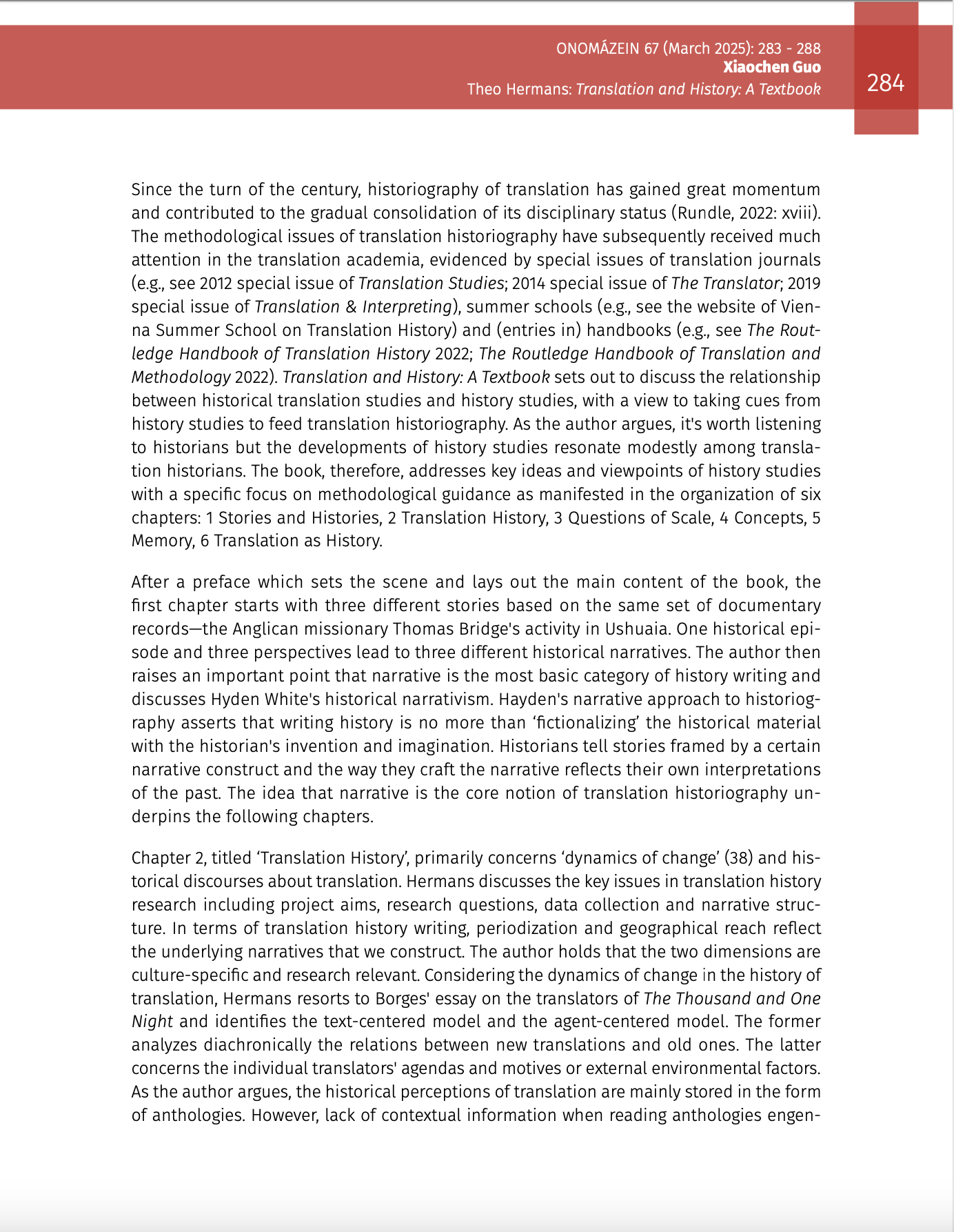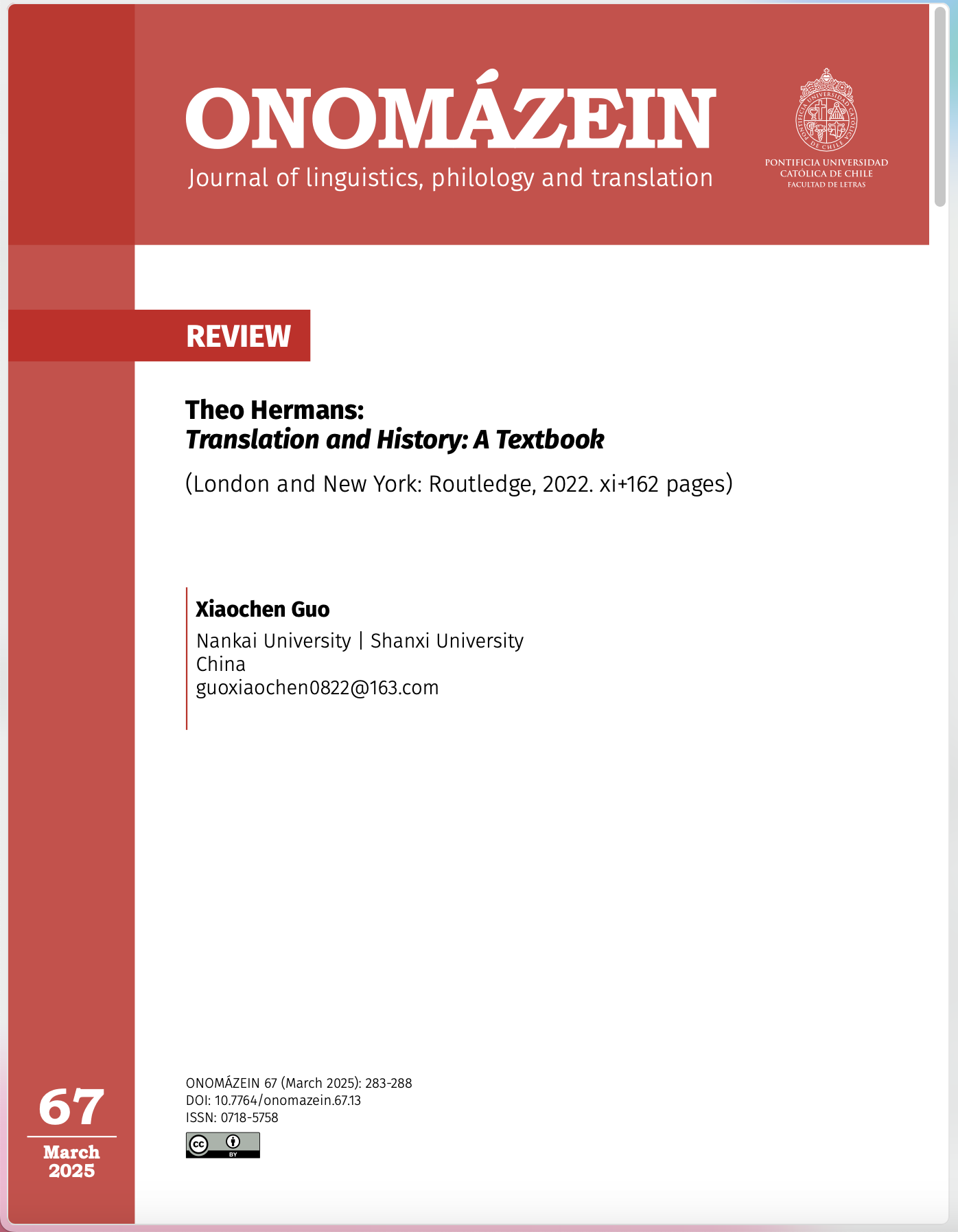公司翻译系教师郭晓晨在SSCI来源期刊ONOMÁZEIN2025年第67期发表题为Theo Hermans: Translation and History: A Textbook的书评论文。ONOMÁZEIN创刊于1993年,由智利天主教大学主办,自 2017 年起以季刊形式出版,每年另推出两期专题特刊。该刊致力于推动语言学、古典文学与翻译学领域的原创性与跨学科研究,为国际学术界广泛认可。