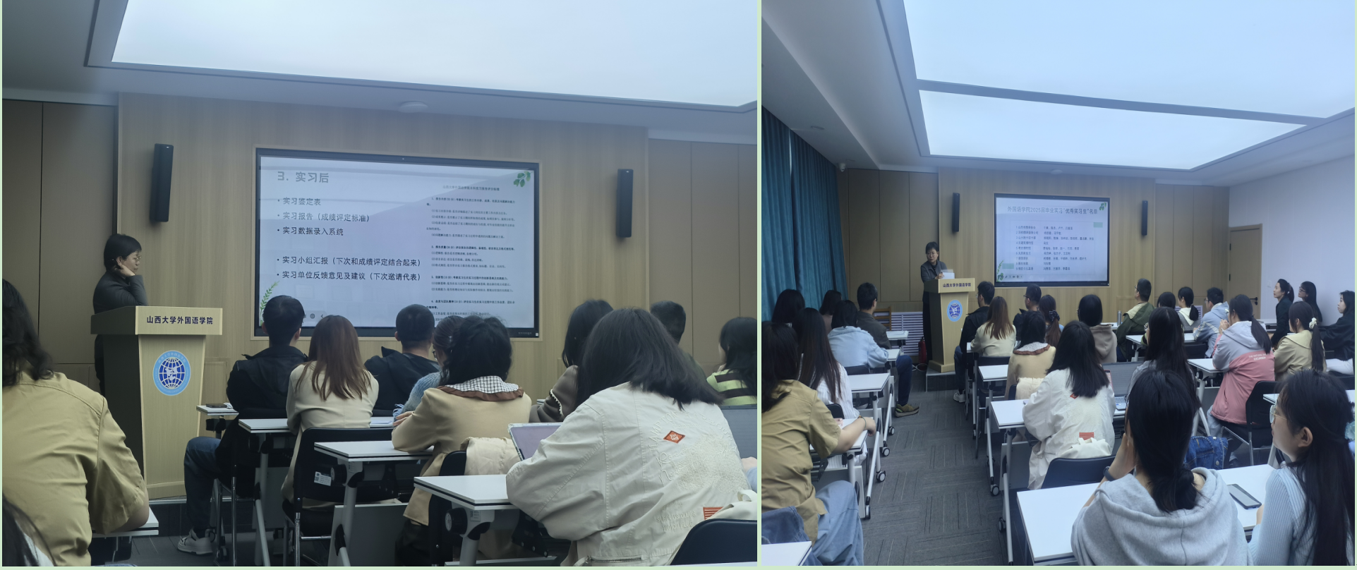 太原联桥翻译公司实习员工代表项宇航同学介绍了公司基本信息和小组成员分工,并表示实习是一次宝贵的学习机会,同学们走出校园,走进社会,亲身感受职场的氛围和工作的要求,加深了对专业知识的理解和应用。山西省翻译协会实习员工代表于爽同学介绍了译协的基本情况以及小组成员的翻译工作,分享了一些实习感悟,并表示大家都希望未来成为对社会有贡献的外语人。新东方实习员工代表侯欣婷和张西子分别介绍了在新东方的工作内容和各自成员的工作感受,表示通过实习工作自己的抗压能力和沟通能力都得到了很大的提升。