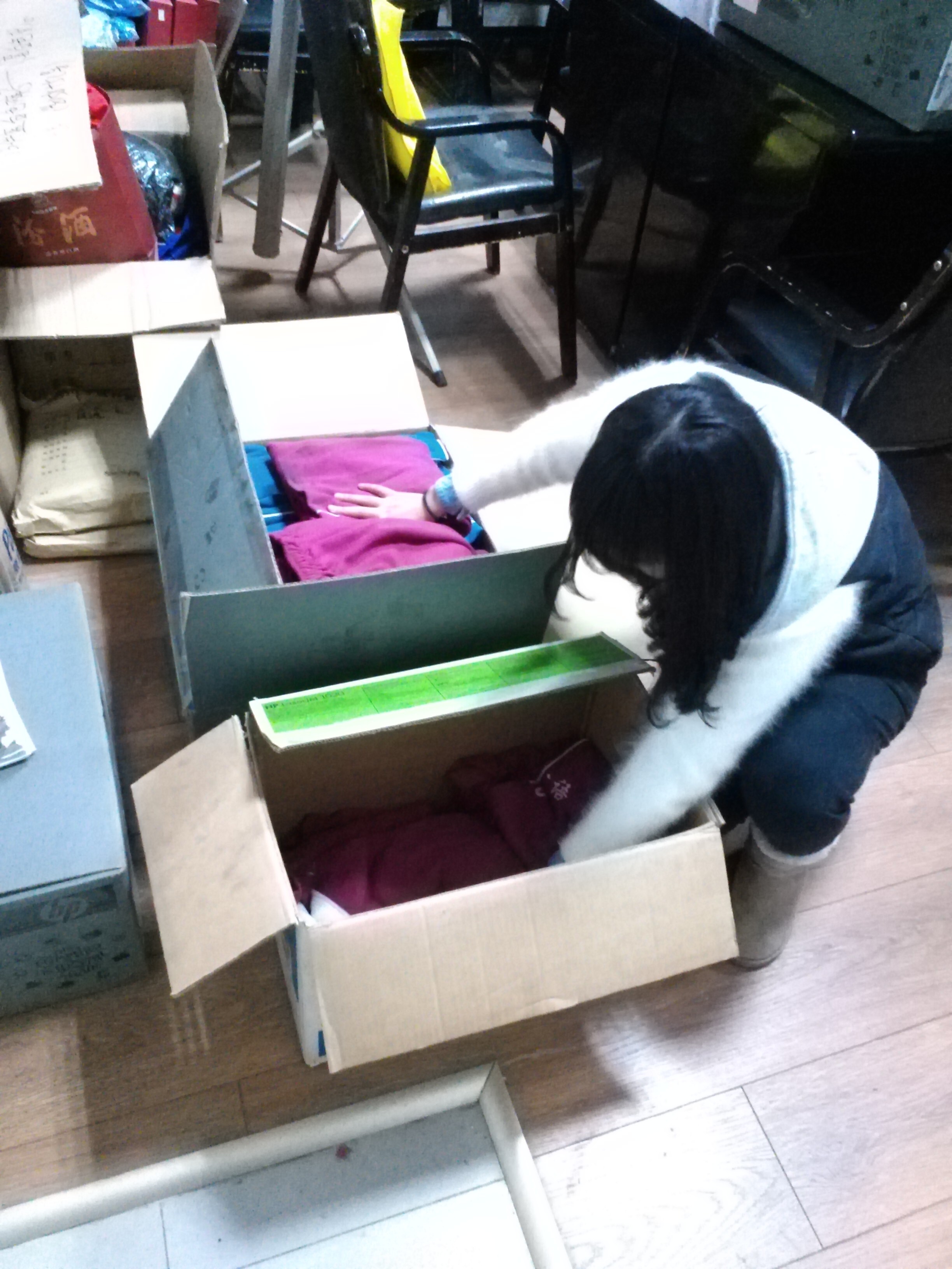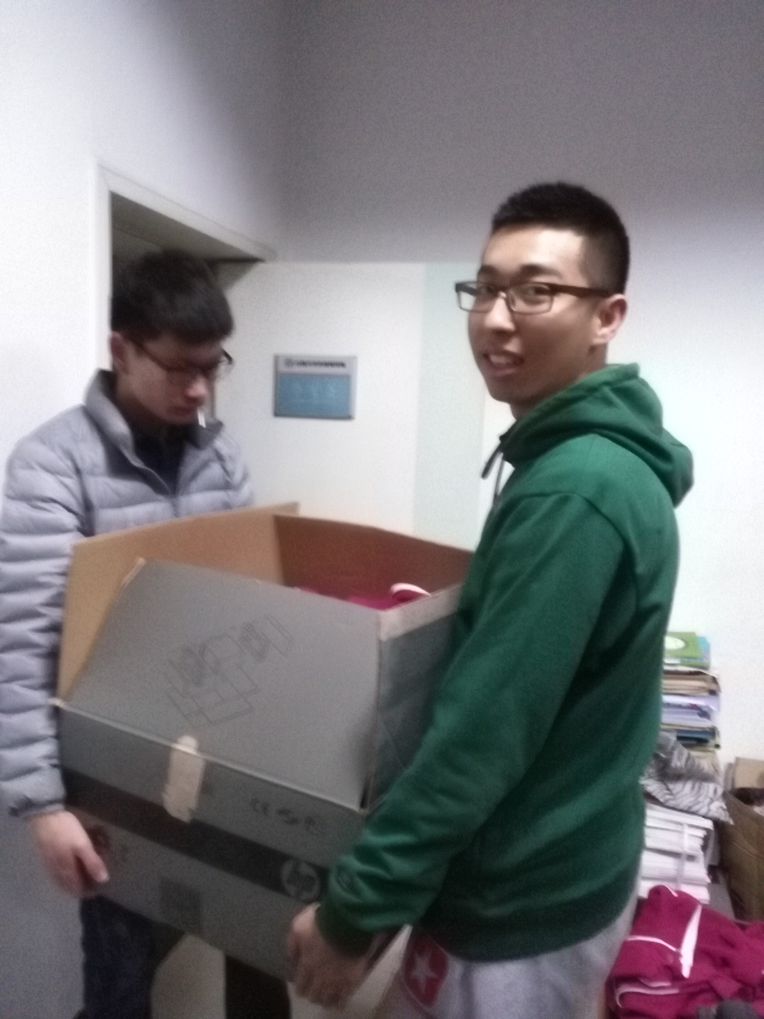 捐赠衣物是公司几年前的旧运动服,放在公司仓库搁置了很长时间。生活部的同学们趁课余时间认真地收拾了一套套服装,把衣服都叠好整整齐齐放在四个大箱子里。他们收拾得非常仔细,仿佛在完成一项光荣而神圣的任务。是啊,这的确是一件值得好好做的事,因为它的意义绝不仅仅是给孩子们送去一件衣服那么简单,它更是温暖了山区孩子们的心灵,也温暖了这个寒冷的冬季。由于这些衣物被长时间搁置,部分衣物沾染了不少灰尘,为了给孩子们送去干净暖和的衣服,需要把它们搬送到洗衣店清洗一遍。从公司仓库到令德地下洗衣店,是有一段距离的。虽然,屋外气温很低,每箱衣物都挺重的,但是大家伙干得都很开心,已然陶醉于这个平安夜里温暖的爱心活动当中。在一路平安夜温暖灯光的照耀下,在一曲曲温馨的圣诞歌谣的陪伴下,四大箱衣服被抬到了令德洗衣店。店主听说这些准备洗的衣服是送给云南贫困地区的孩子们过冬之后,他们也露出了欣喜的笑容。那份笑容,也必将成为圣诞夜里一道独特的风景线,也是圣诞老人带来的一份礼物吧。