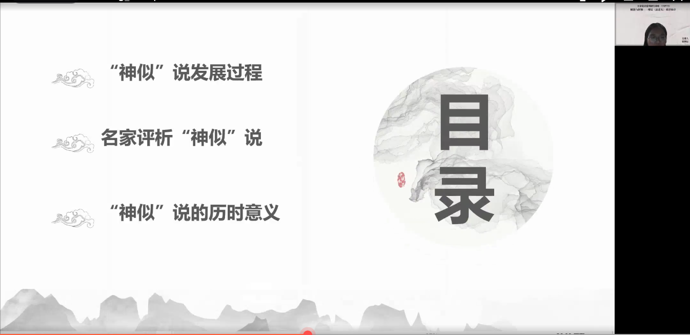 接着,在前两位同学带大家熟悉了原文和英译文后,贾梦辰同学为大家介绍了从上世纪至今的一些翻译大家对傅雷“神似”说的评价与讨论,并分析了“神似”说的历时意义。首先,贾梦辰同学为我们梳理了“神似”说发展的过程,让同学们对这一著名的翻译理论有了更加清晰的认识。原来“神似”说并不只是由傅雷先生一人提出的,在先生之前,早已有学者提出过类似表述。但是,“神似”说这一重要翻译理论的确立及成形却离不开傅雷先生的努力。正是因为先生坚持对读者负责,对译文精益求精的精神,才在多年的实践与对理论的思考中促进了这一翻译理论的成熟。最后,从各名家对“神似”说的评析可以看出,“神似”说及其提出者傅雷先生在我国翻译历史上都占有重要地位,在指导后来人做翻译,提升我国翻译工作者的专业水平上具有里程碑意义。