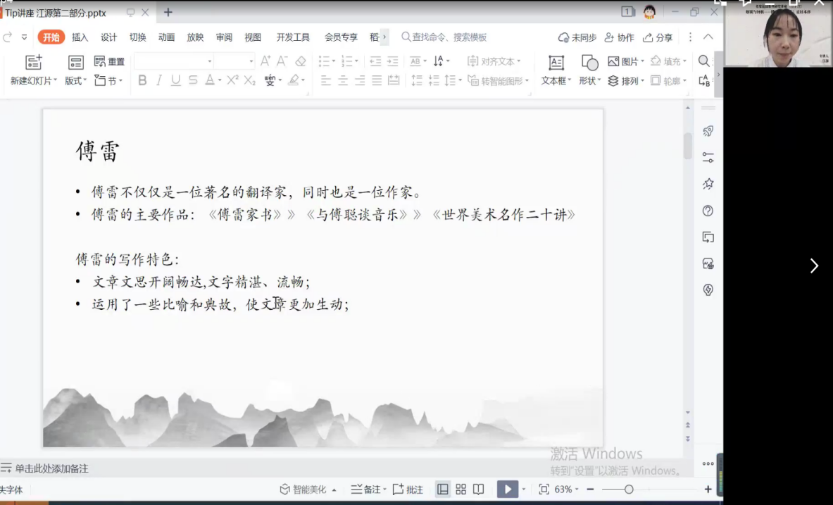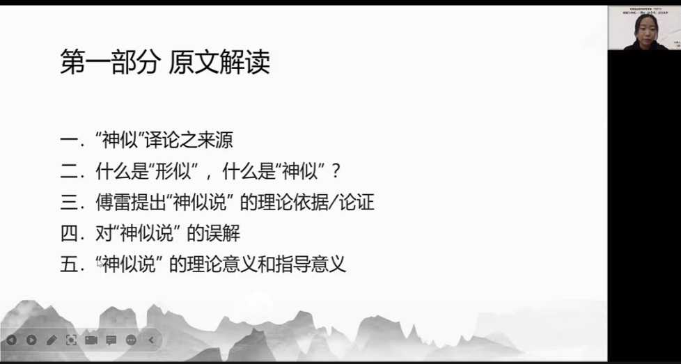本次讲座的第一部分由马倩同学主讲,她从五个方面入手,对傅雷在《高老头》重译本序中的“神似”翻译主张进行了解读。首先,她提到了“神似论”的来源;其次,她对什么是“形似”,什么是“神似”进行了解释;再次,她给出了傅雷提出“神似说”的理论依据或论证。此外,她还提到许多人对傅雷先生的“神似说”存有误解,并对其进行了正确解读,强调“神似”不是可以抛开“形似”,更不是不要“形似”,而是要把两个方面都考虑进去。最后,她阐述了“神似说”提出的理论意义和现实指导意义。