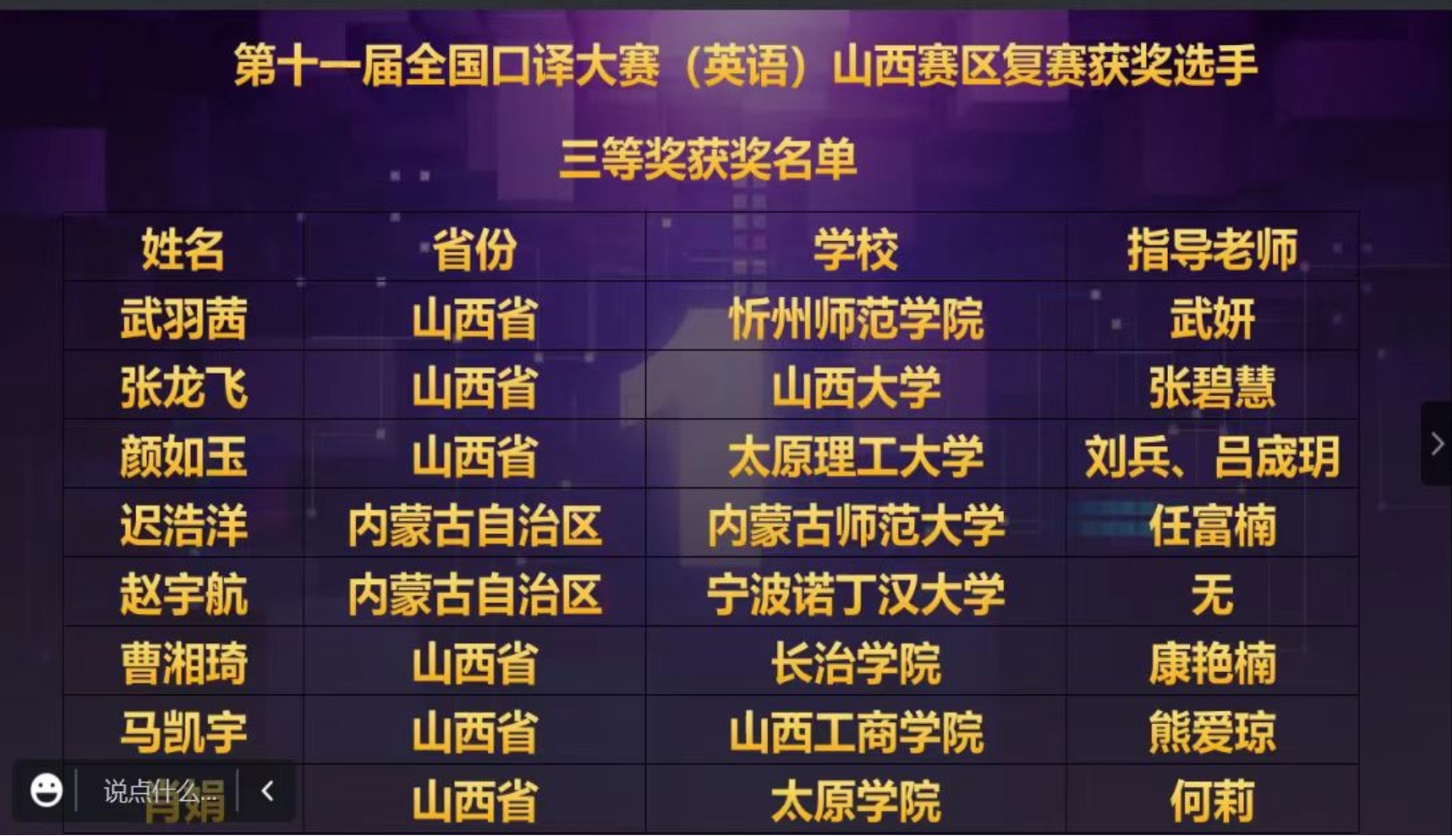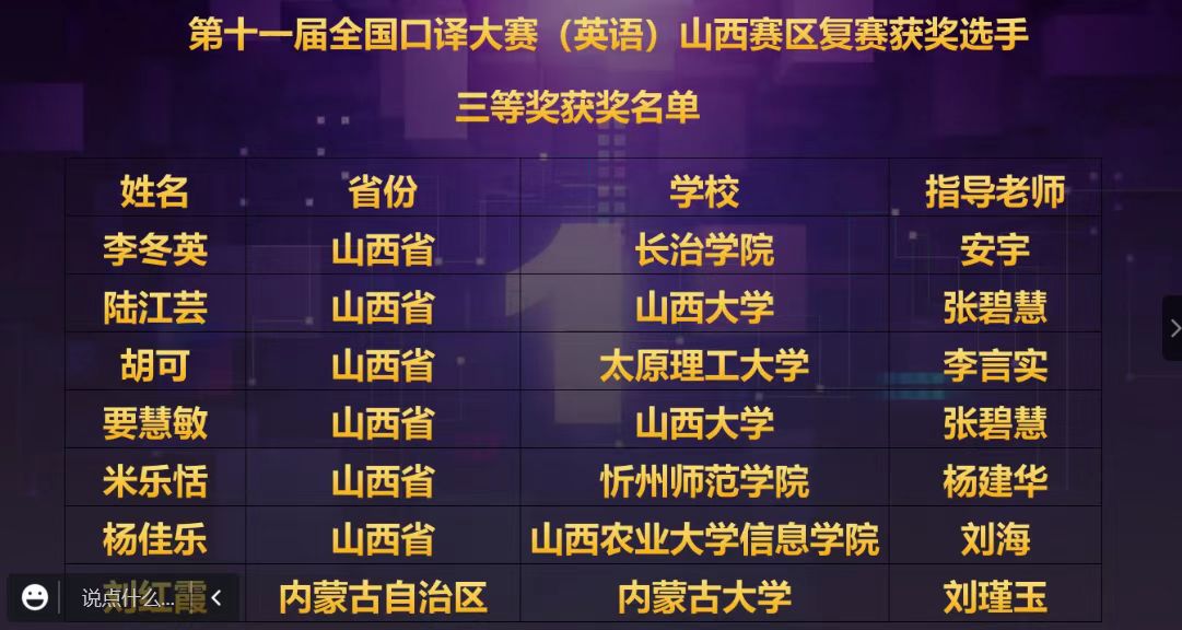 7月10日上午,第11届全国口译大赛山西/内蒙古赛区复赛结果揭晓,公司学子表现优异,取得了不俗的成绩。2018级翻译专业员工应越取得本赛区一等奖第一名,获得省级“口译之星”、2019级翻译专业员工王馨婕、陈宇欣获得一等奖、2018级翻译专业员工张龙飞、陆江芸以及2019级翻译专业员工要慧敏获得三等奖。张碧慧老师获得优秀指导教师奖。