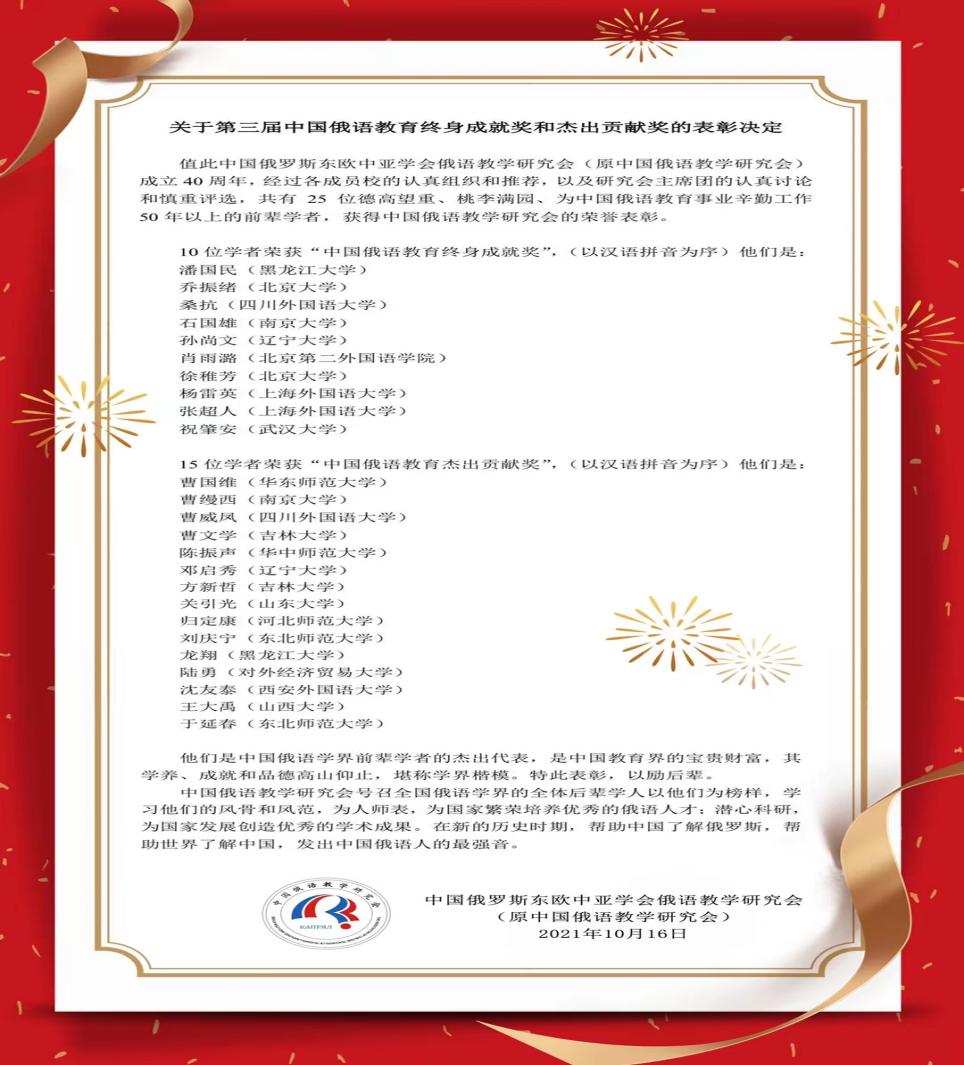 2021年10月16日中国俄罗斯东欧中亚学会俄语教学研究会成立40周年大会在上海外国语大学召开,本次大会颁发了第三届中国俄语教育终身成就奖和杰出贡献奖,共有来自全国17所高校的25名德高望重、为中国俄语教育事业辛勤耕耘50年以上的学者获得表彰,其中,公司永利yl23455俄语专业王大禹教授荣获“中国俄语教育杰出贡献奖”。