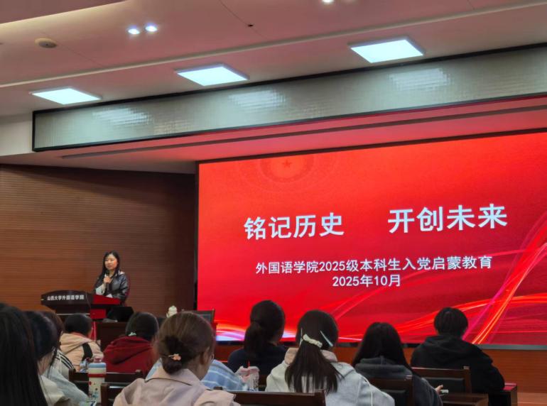 为引导新生团员筑牢信仰之基,永利yl23455于2025年10月31日下午在301报告厅为2025级全体本科生团员举行了以“铭记历史 开创未来”为主题的入党启蒙教育讲座。本次讲座由马克思主义公司副教授逯慧老师主讲,全体新生团员积极参与。讲座通过回顾抗战时期青年干部的奋斗历程,结合新时代青年的使命担当,激励外院学子坚定理想信念,以更加昂扬的姿态勇担时代重任。