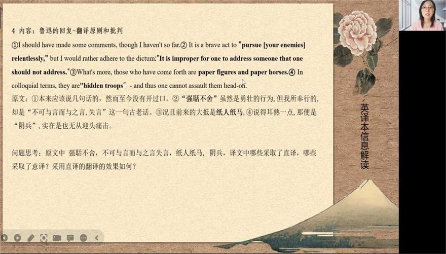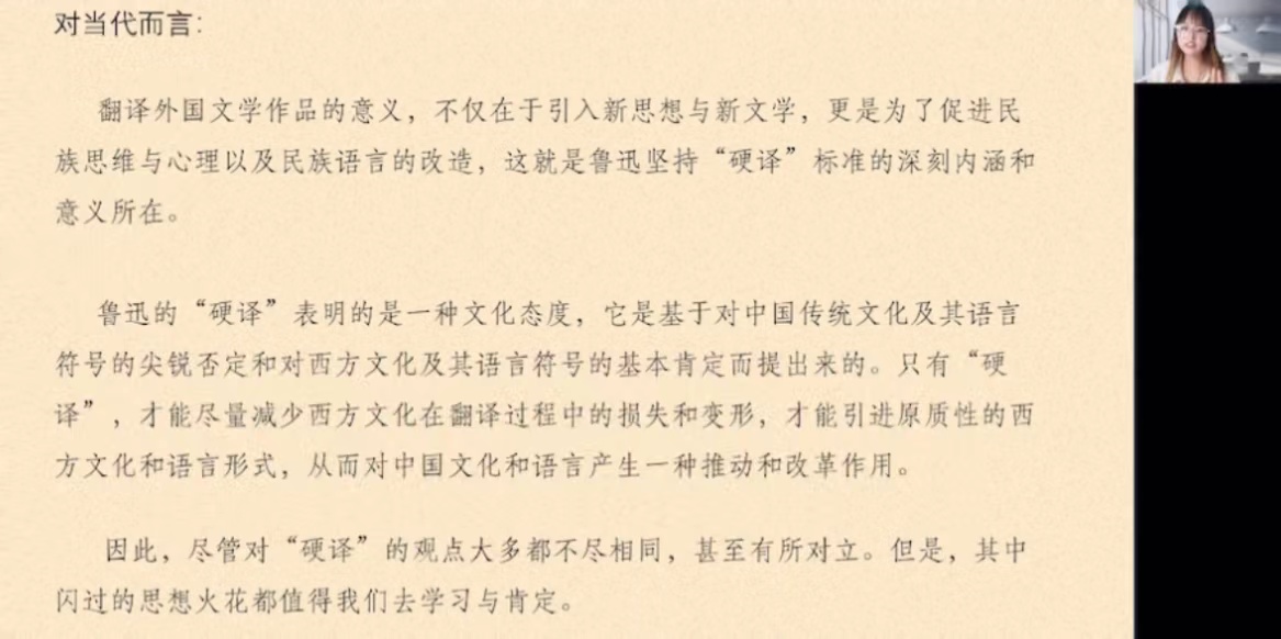 讲座的第二部分由杨晓冉同学主讲,主题为鲁迅和瞿秋白通信的中文原文和英语译本的解读。首先,她针对鲁迅和瞿秋白的争论焦点和各自翻译主张进行了原文解读,接着分别介绍了英译本的译者邱伟平教授和陈德鸿教授,将其译文和原文进行对比赏析。杨晓冉同学依据译文是否再现原文信息,是否存在偏离原作观点的解读原则,采用问题思考引导方式,从直译、意译和文化语境等角度进行赏析,先后列举了“强聒不舍”、“不可与言而与之言失言”、“纸人纸马”、“阴兵”、“茶泡饭”等带有中国文化语境的译文,来解读译者的处理方法和效果并提出了优化建议。