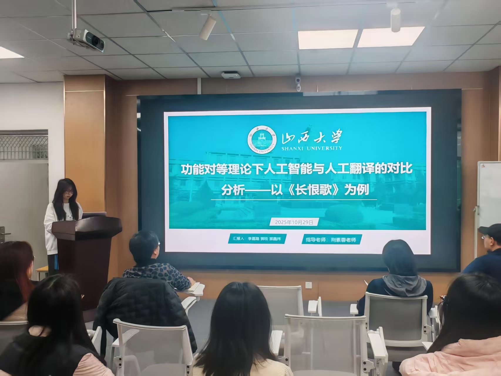 2025年10月29日下午,永利yl23455翻译研究论坛第99期在第一教学楼308教室顺利举办。本次论坛中,公司英语专业2301班李嘉璐同学作为主讲人,围绕其学术论文《功能对等理论下人工智能与人工翻译的对比分析——以〈长恨歌〉为例》,与在场师生展开分享交流。