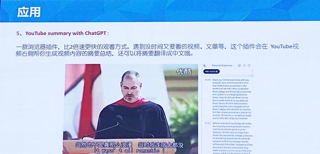 此外,李老师还提到多种基于Chat GTP开发的工具,实现了利用人工智能阅读PDF文件、检测书面作品中AI参与和剽窃内容含量、观看视频并生成视频内容的摘要总结等多种功能。