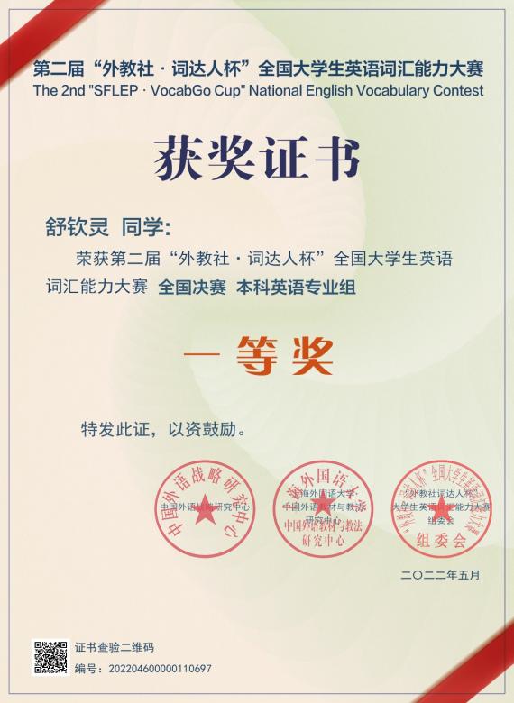 在5月28日举行的全国决赛中,舒钦灵同学继续展现实力,在全国737所院校共计2257位选手中脱颖而出,取得本科英语专业组全国决赛第11名的好成绩,荣获全国决赛一等奖。