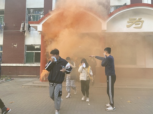 首先进行的是消防疏散活动。假设文瀛十五斋发生火灾,警报响起,全体大一新生在听到警报后立刻用湿毛巾捂住口鼻,听从指挥,弯腰前进,撤离至宿舍楼外安全地点。全员完成疏散共计用时一分钟,疏散演练迅速而有序。模拟火灾现场环境的效果真实,还原度高,让大家更好地掌握了突发情况下的自救和逃生技能。