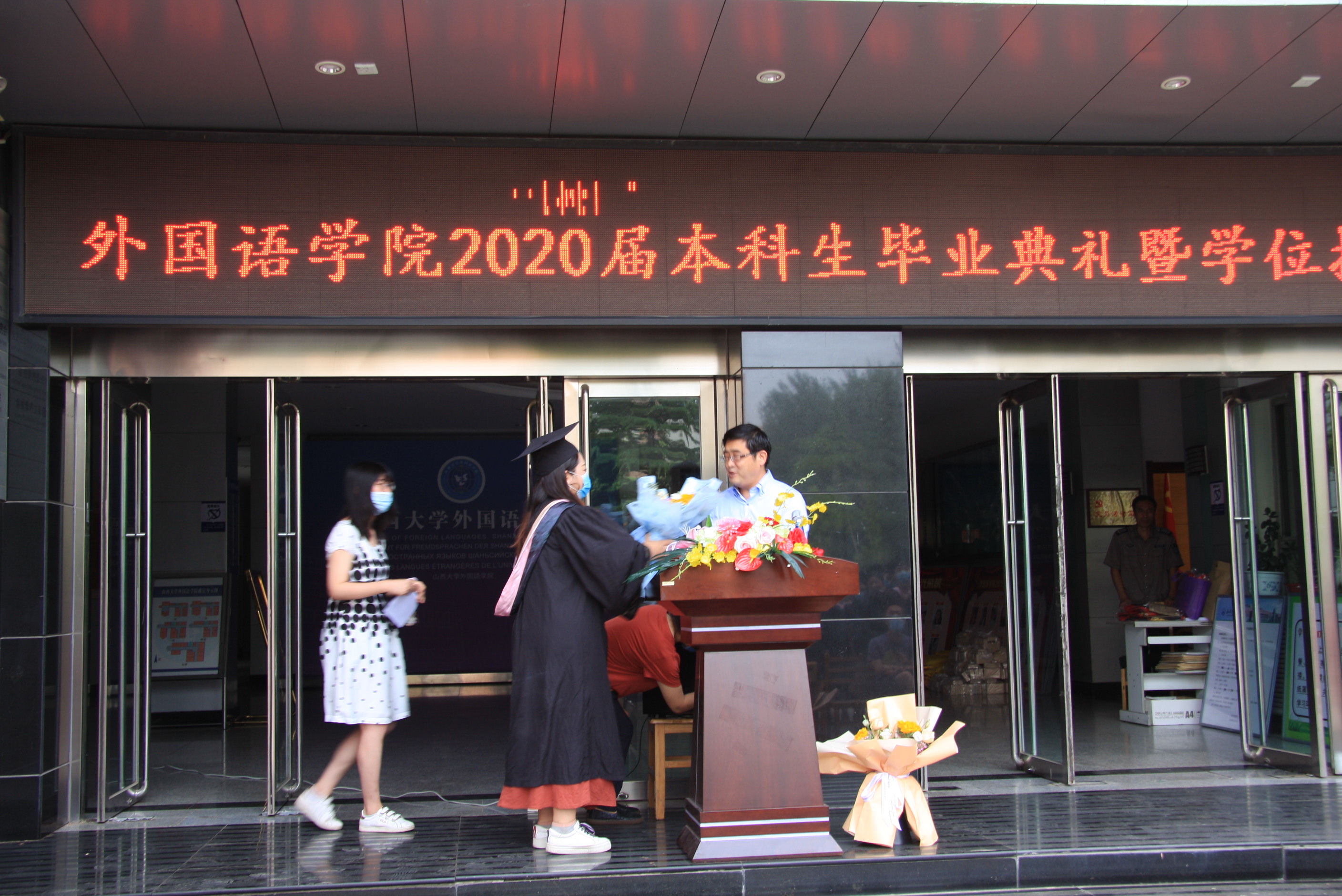 早上不到8点,公司门口电子屏打出了“2020届本科生毕业典礼暨学位授予仪式”, 熟悉的音乐响起,辅导员和一部分同学早早就开始了准备,各位领导、系主任、专业课老师,各位行政老师,都陆续到来,同学们手捧鲜花回到了熟悉的新楼。老师穿起了红色导师服,同学们穿起了粉色垂布的学位服,洋溢着节日般庆祝的气氛。与以往不同的是大家都戴着口罩,彼此之间保持一米距离,用眼神互相祝贺,用声音互道祝福。