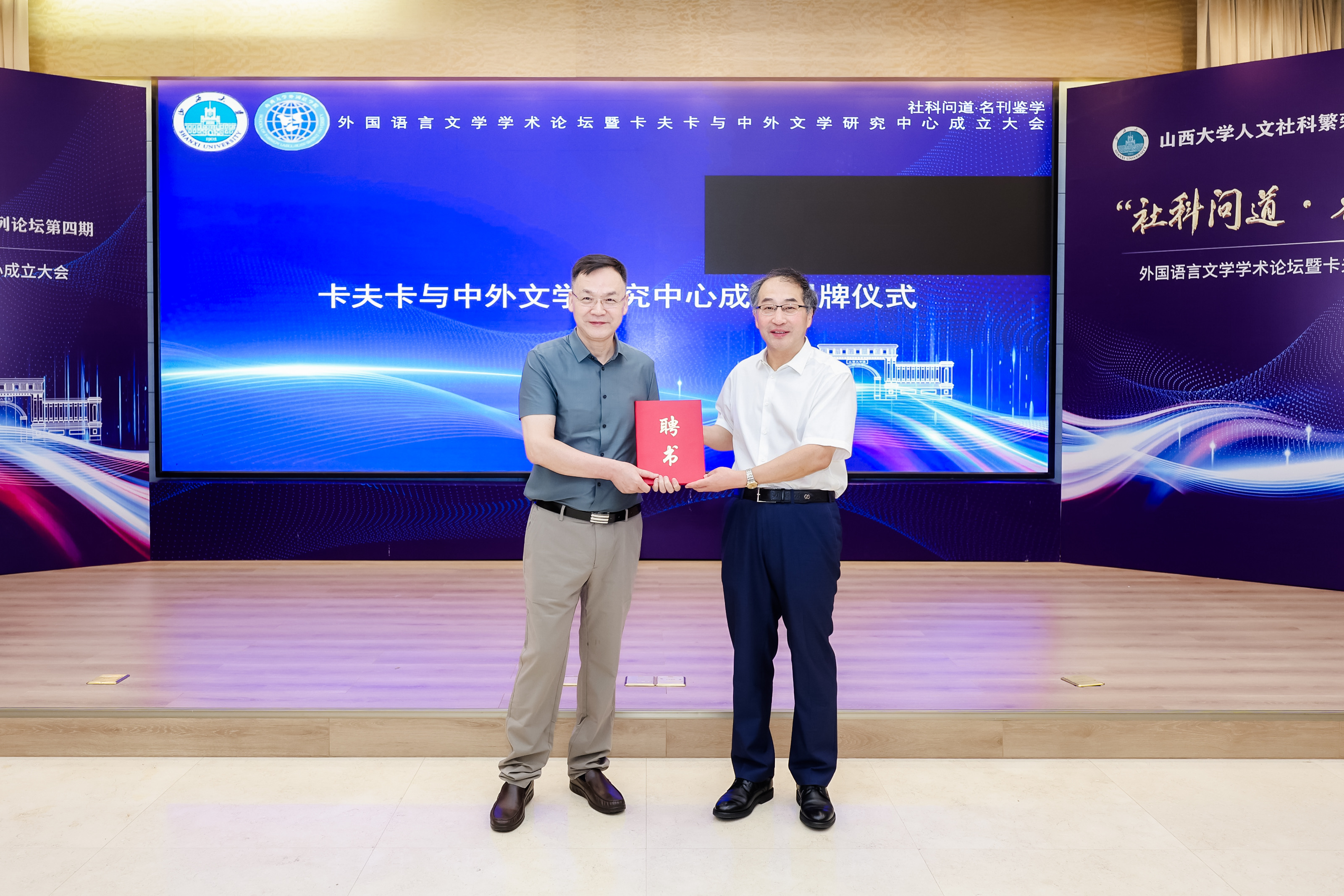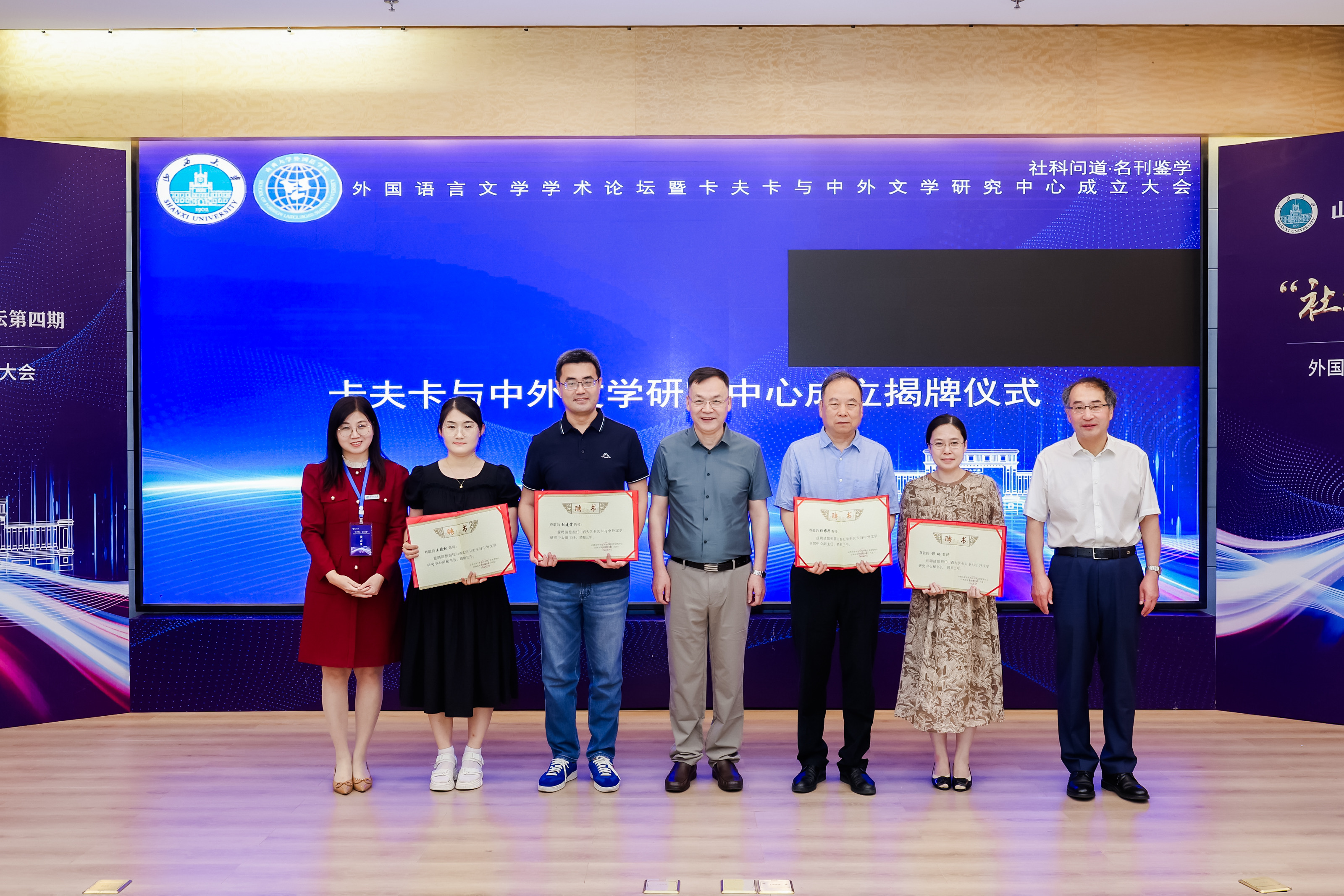 大会隆重举行了卡夫卡与中外文学研究中心成立揭牌仪式及聘任仪式。孙岩为曾艳兵颁发中心主任聘书,为张耀平、赵建常颁发中心副主任聘书;曾艳兵为郝琳和王晓林颁发秘书长及副秘书长聘书。
