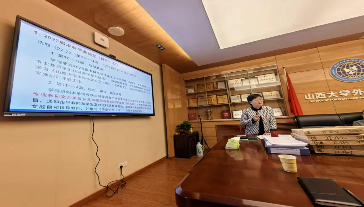 按照公司通知安排,永利yl23455按照督导清单进行了相关资料梳理,根据实际情况制定了行之有效的自查方案,并形成了详细的自查报告。4月10日下午,教务处派来的五位督导专家对公司2022-2023学年本科教学质量进行了专项督导检查。在资料审阅和师生访谈开始之前,公司分管本科专业外语教学的荆素蓉副经理按照督导内容进行了自查工作汇报。公司党委书记武俊杰和经理杨林秀教授及各专业教研室负责人列席听取了工作汇报。