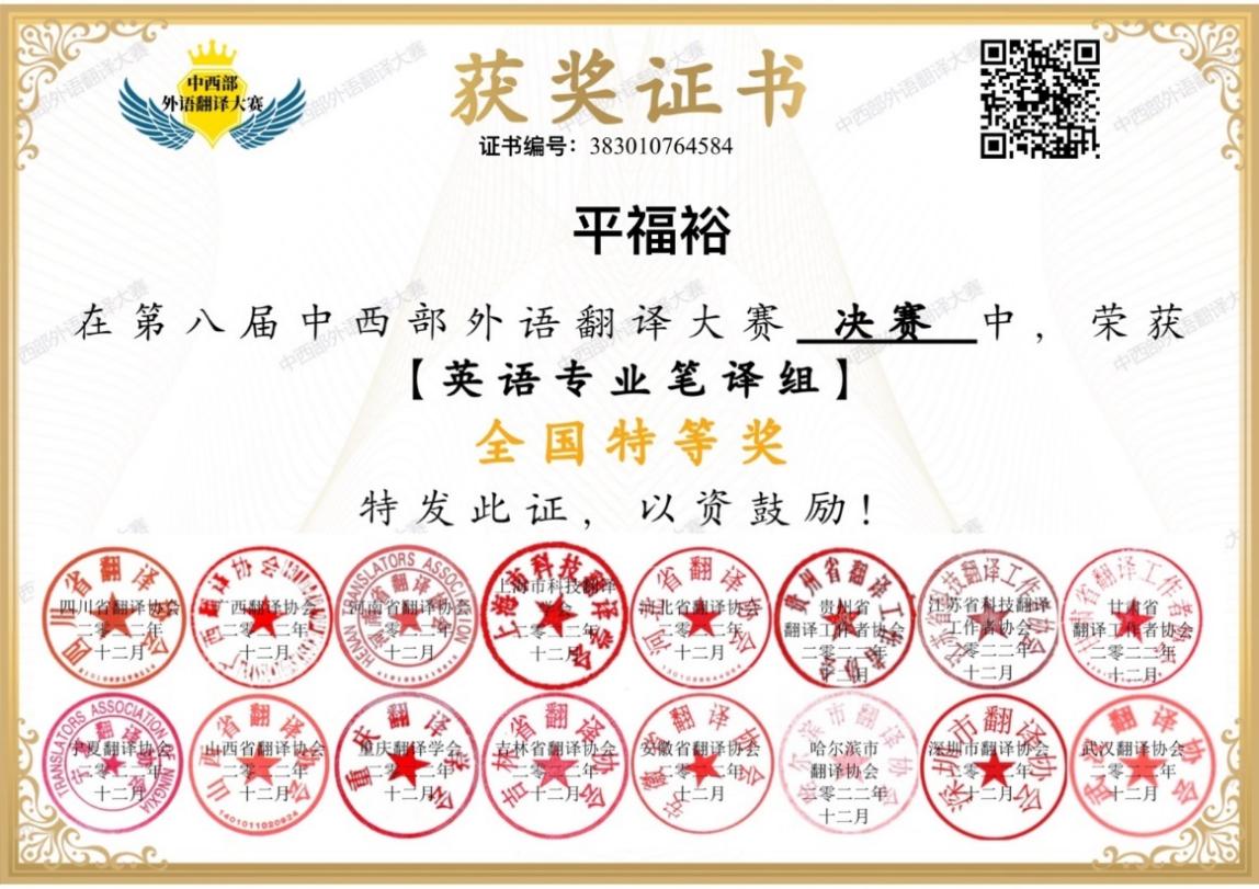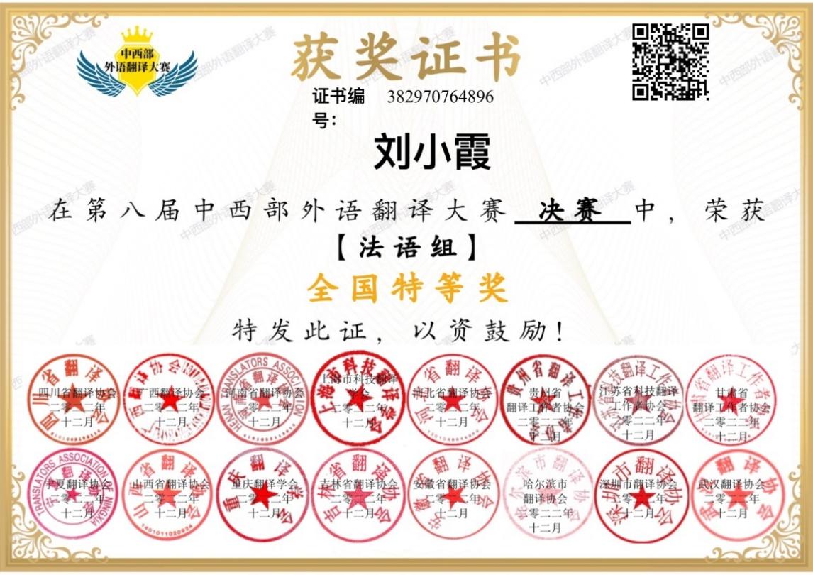 近日,2022第八届中西部外语翻译大赛公布决赛获奖名单,公司英语、翻译、法语、日语和德语专业员工在比赛中勇创佳绩,荣获全国特等奖2项,全国一等奖2项,全国二等奖12项,全国三等奖12项。其中,公司2021级翻译专业平福裕同学荣获英语专业笔译组特等奖,2020级法语专业刘小霞同学荣获法语组特等奖。同时,公司英语专业教师王佩玉荣获“全国精英指导教师奖”。