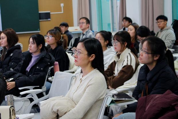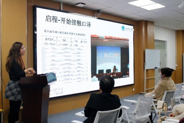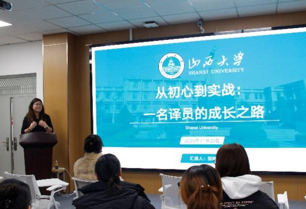 16:40-18:00是口译专题讲座环节,由公司翻译系梁启明老师主持,2024级笔译专业研究生郭姝雅以《从初心到实战:一名译员的成长之路》为题,从自身经历出发,分享译员成长的注意事项,强调译者需具备尊重文化背景、掌握耳语同传技能、敢于认错的品质,同时为大家带来CATTI二级口译证书备考“干货”——勤练习、营造英文环境、培养英语习惯。