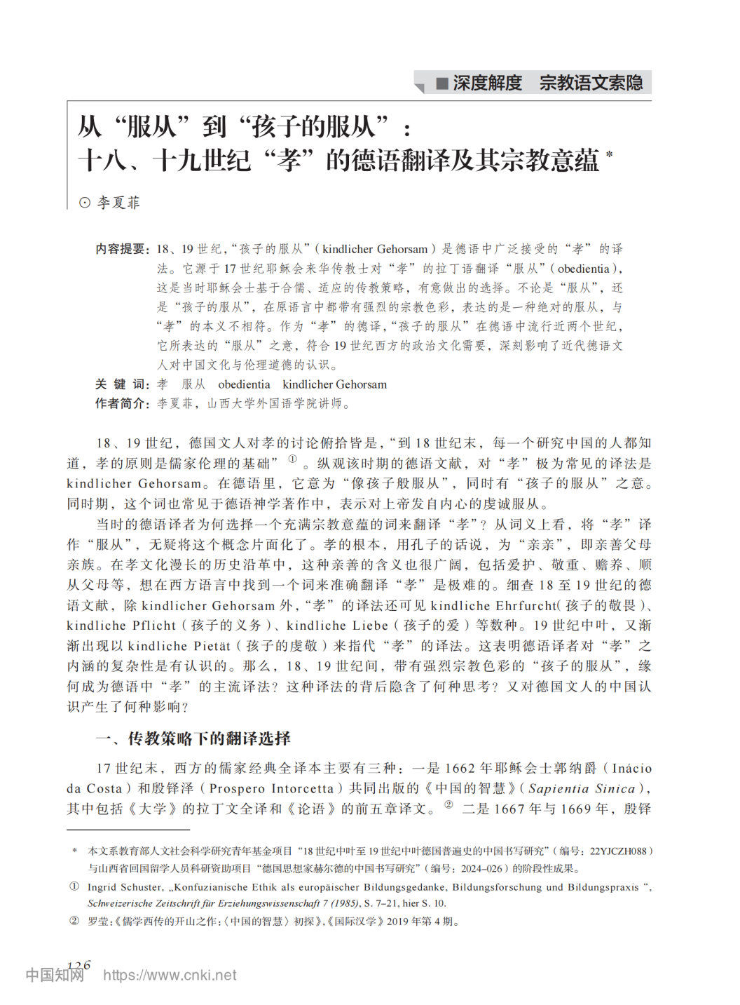 18、19世纪,“孩子的服从”(kindlicher Gehorsam)是德语中广泛接受的“孝”的译法。它源于17世纪耶稣会来华传教士对“孝”的拉丁语翻译“服从”(obedientia),这是当时耶稣会士基于合儒、适应的传教策略,有意做出的选择。不论是“服从”,还是“孩子的服从”,在原语言中都带有强烈的宗教色彩,表达的是一种绝对的服从,与“孝”的本义不相符。作为“孝”的德译,“孩子的服从”在德语中流行近两个世纪,它所表达的“服从”之意,符合19世纪西方的政治文化需要,深刻影响了近代德语文人对中国文化与伦理道德的认识。