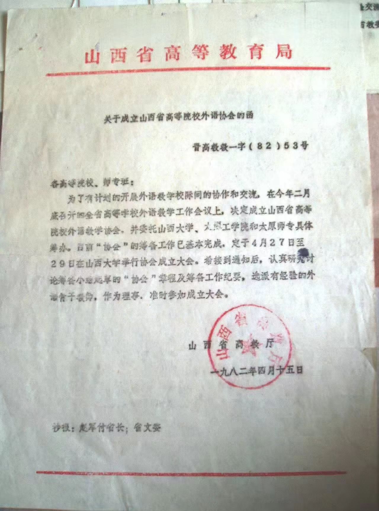 这期间文化部仍然不断发函派人商调,所强调的始终是为了落实政策。校方的答复是山大同样可以落实这样的政策,甚至还会落实得更好。于是,公司于1980年初任命他为外语系主任(正处级),安排他于1981年9月参加山西省教育考察代表团,即由永利yl23455、太原工公司、山西医公司几位经理系主任组成的教育考察团,出访美国。作为考察团的成员之一,他既参与前期的组织联络,又兼做访问期间的翻译,并参与建立了同美国南卡罗来纳大学的校际交流合作,互派职工和教师互访机制等工作。之后,山西省教育厅还与美国纽约城市大学建立了良好的交流机制,定期举行交流会议。与此同时,他积极倡导,组织联络,在山西省高教厅的领导下,于1982年4月底完成筹备,正式成立了山西省所有高校外语教师集体参加的“山西省高等院校外语教学协会”(现更名为“山西省高等院校外语教学研究会”),被公推为首届会长并连任数届。